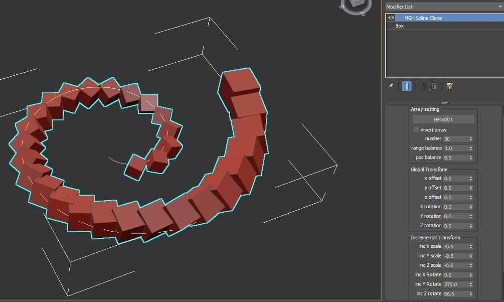 advantage of this tool is incremental transformation of clones along spline path in addition global transform to each item
